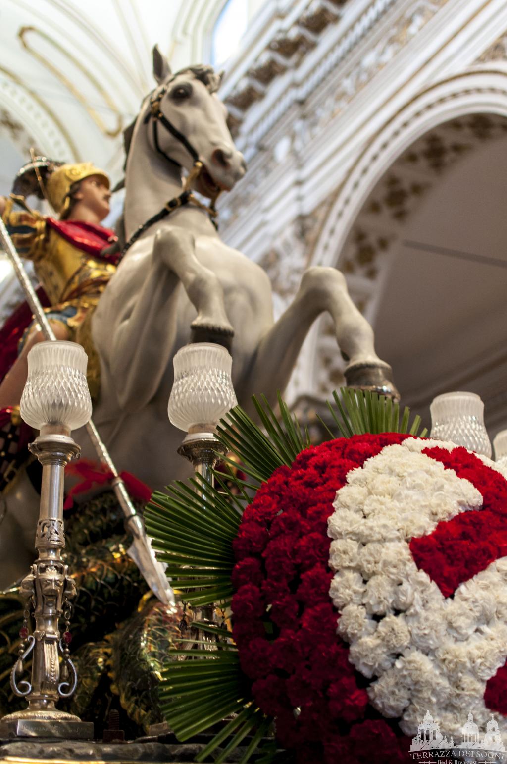 The statue of the Saint is a opera of the sculptor from Palermo Giuseppe Bagnasco, made in 1842. The body of the statue, the horse and the dragon are made in poplar and lime wood. Oat and chestnut the basement for a total amount of 500kg. the armor, the plumed helmet and the finishing horse are in silver geminated with gold.