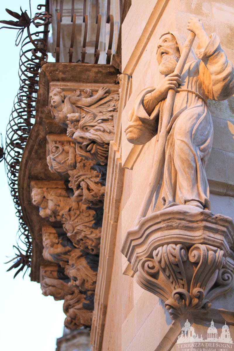 The prospect is count seven balconies supported by three big “mensoloni” made of typical “pietra pece ragusana”. There are also spectacular representation like: the flutist, the lute player and a mother holding a baby.